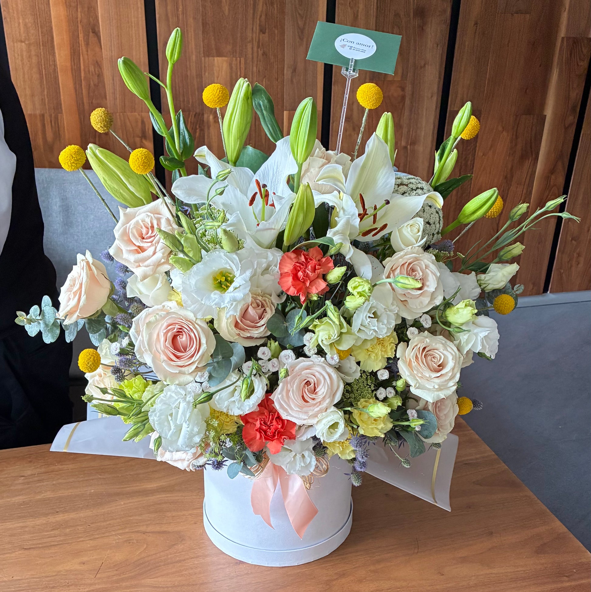 Hermoso arreglo con rosas, claveles, Lilis, raffin y dólar en base.