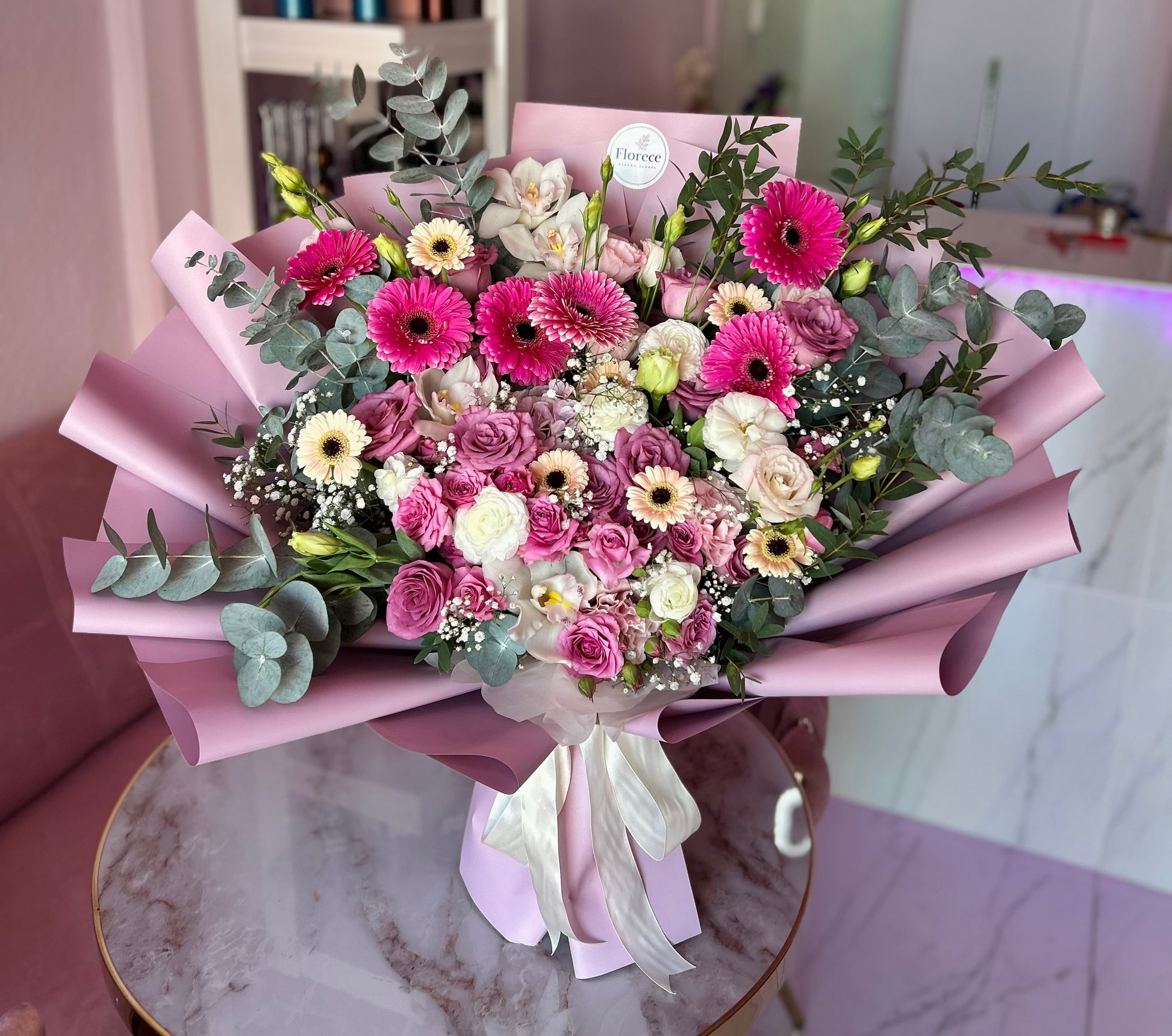 Ramo con rosas, gerberas, mini gerberas, hortensia, orquídea en celofán coreano y moño satinado.