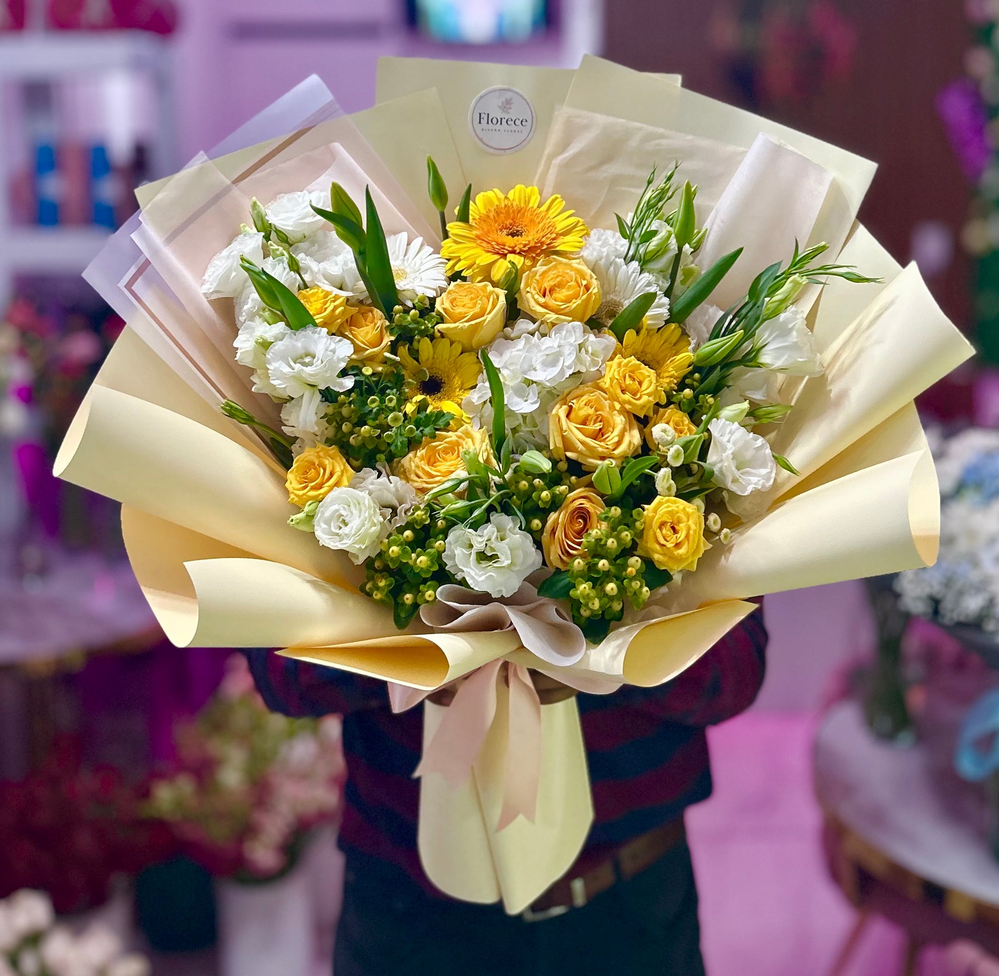 Ramo con tulipanes, gerberas, lisianthus, rosas y follaje.