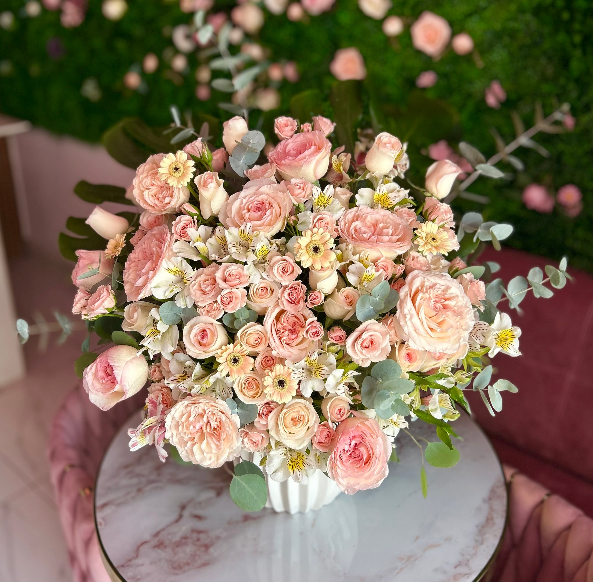 Hermoso arreglo con rosas inglesas, mini gerberas, mini rosas y alstroemeria en base de cerámica.