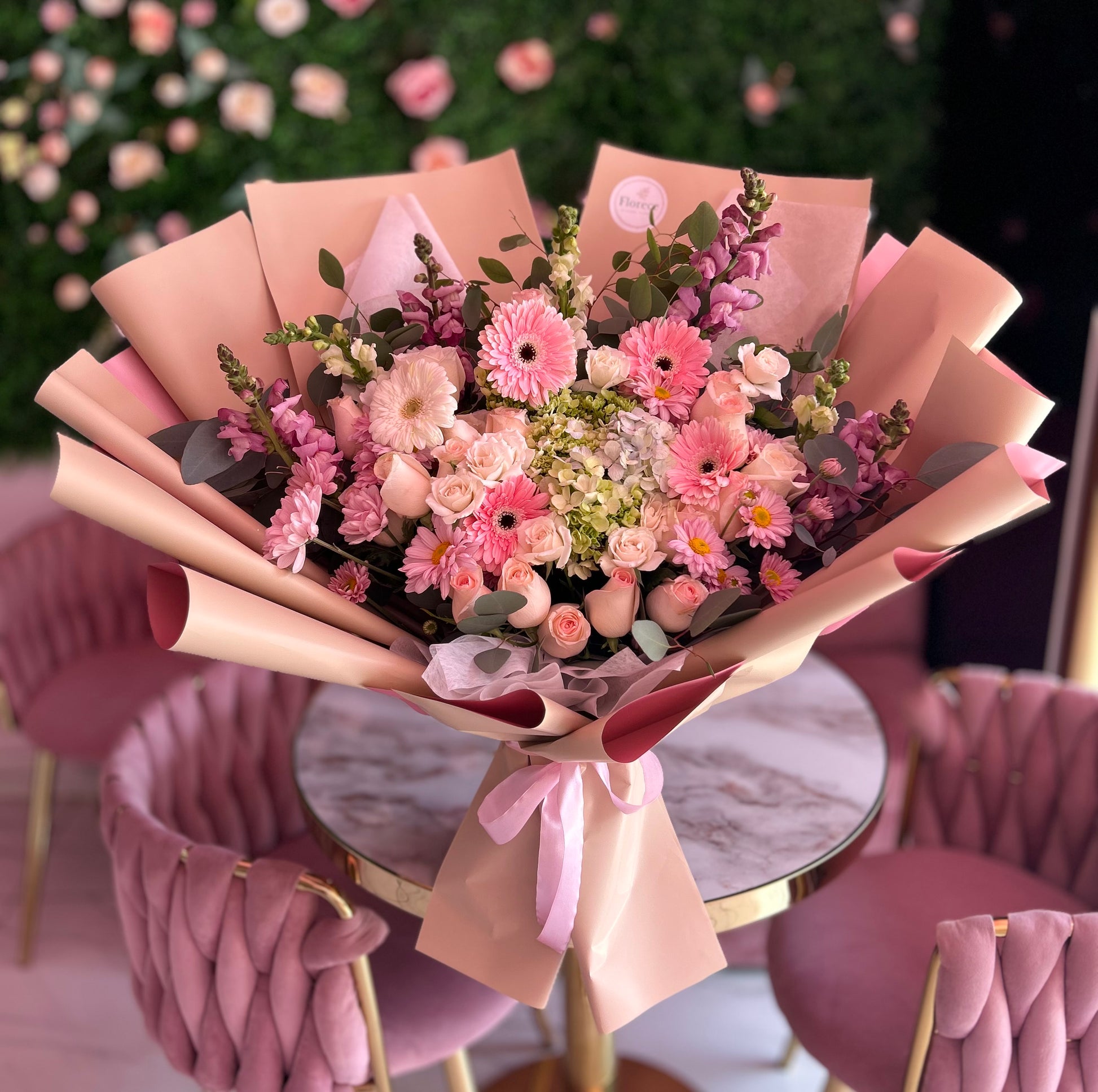 Ramo con mini rosas, rosas, gerberas, lisianthus, hortensias, perrito y follaje en celofán coreano y moño satinado.