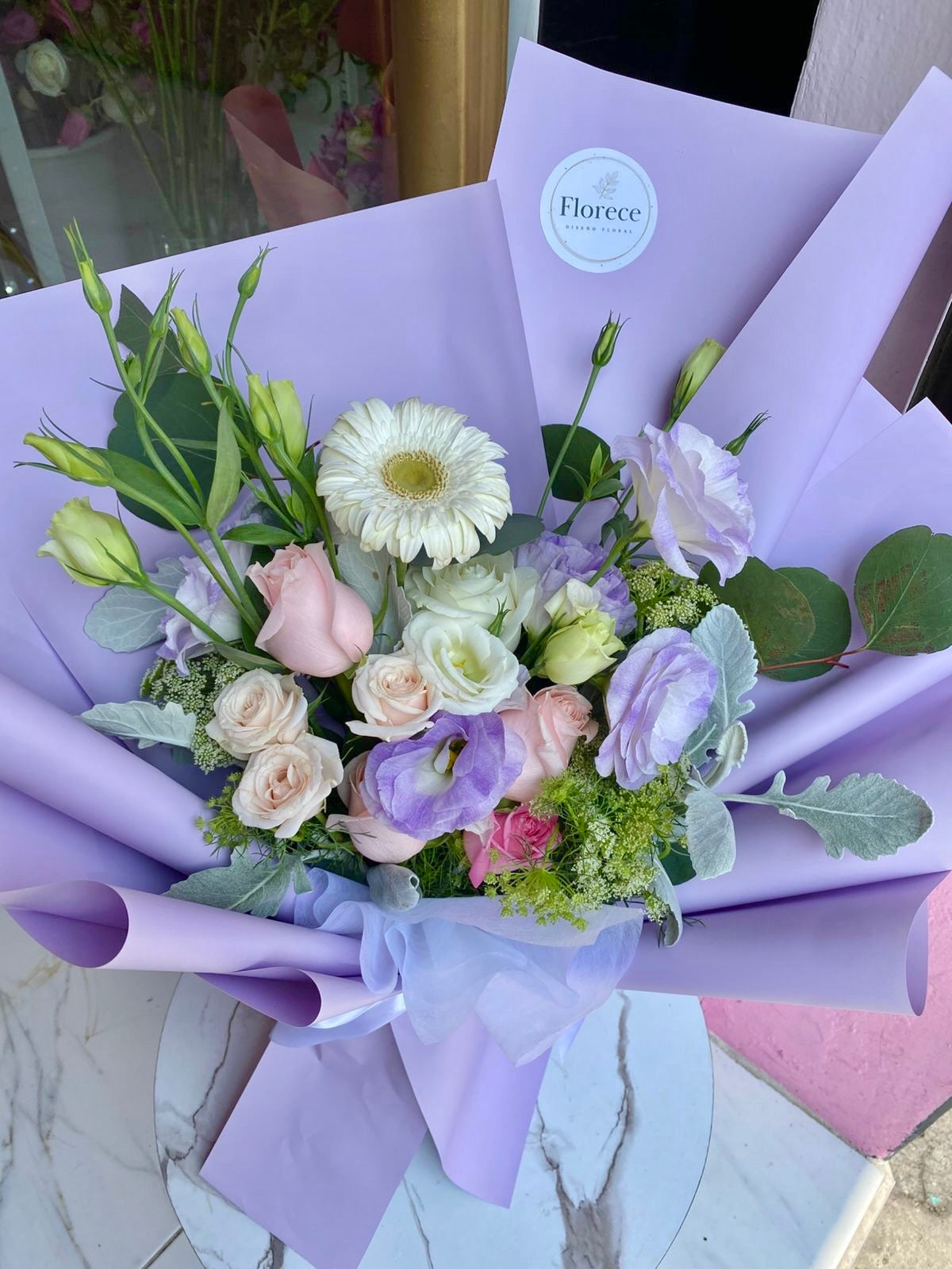 Ramo con rosas, Lisianthus, gerberas y follaje