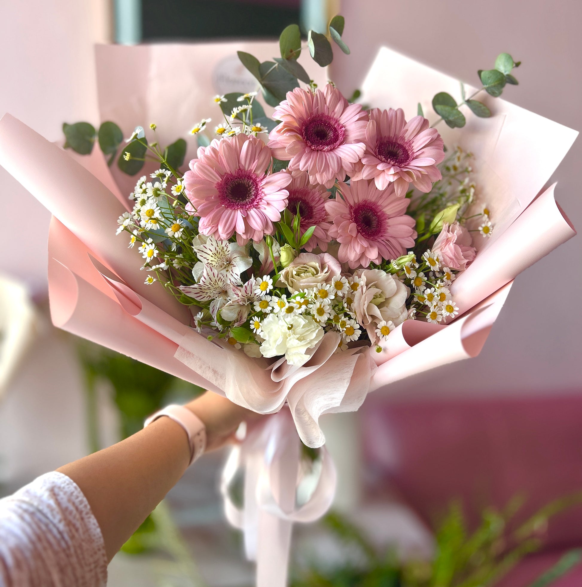 Ramo con Santa María, gerberas y malibú en papel coreano y moño satinado.
