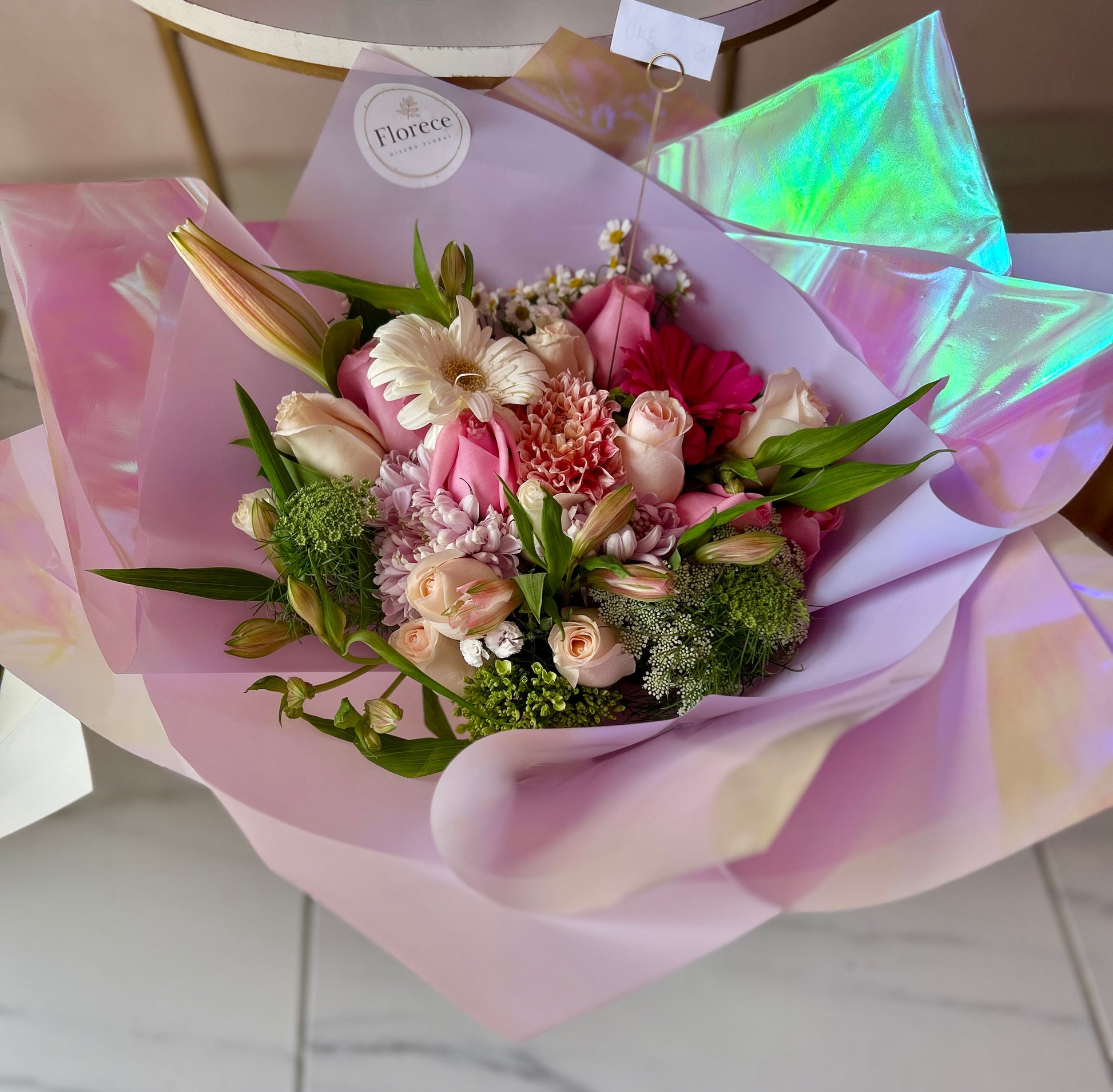Hermoso ramo con Lisianthus, rosas y gerberas