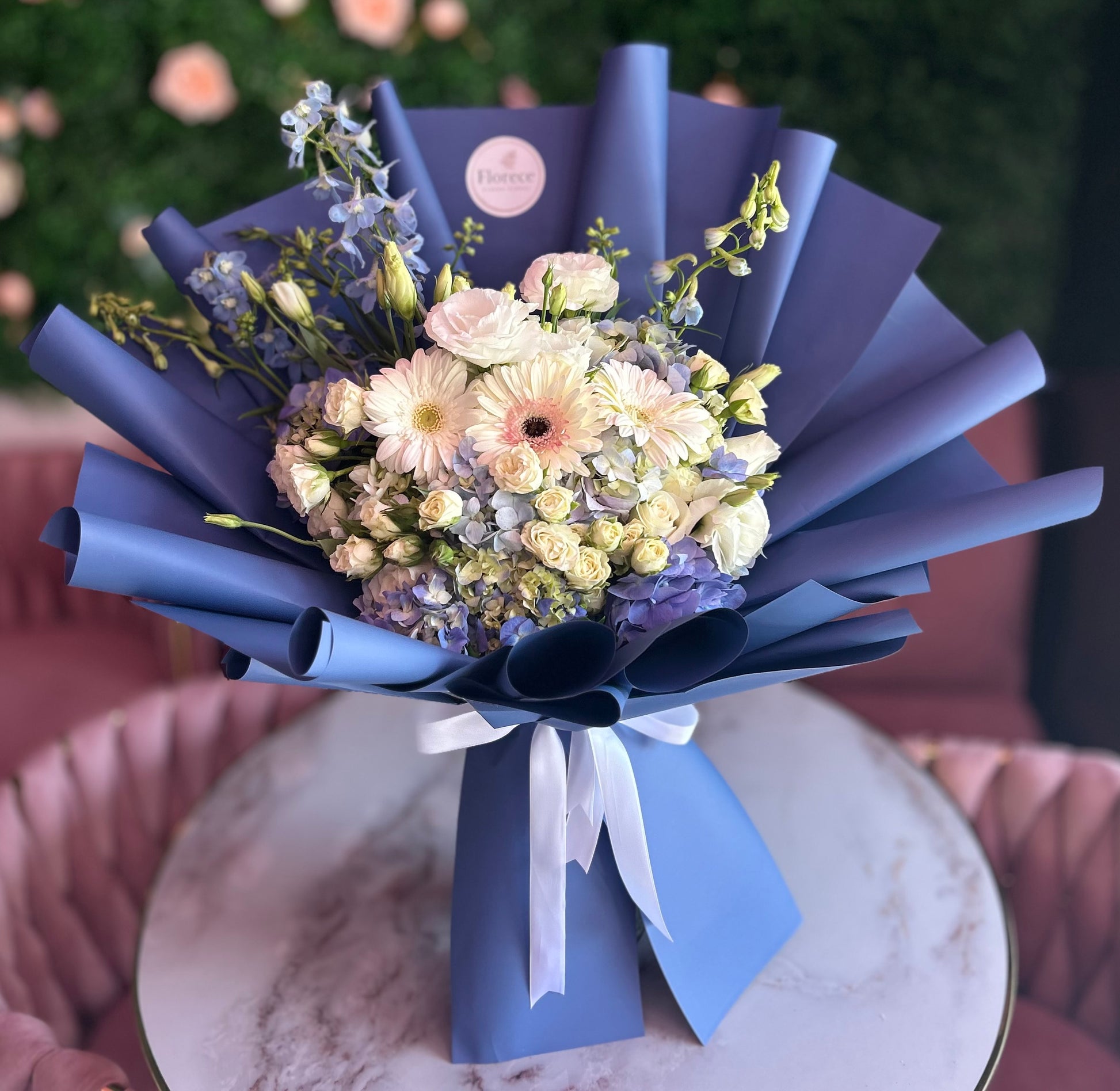 Hermoso ramo con hortensias, gerberas, rosas y follaje.