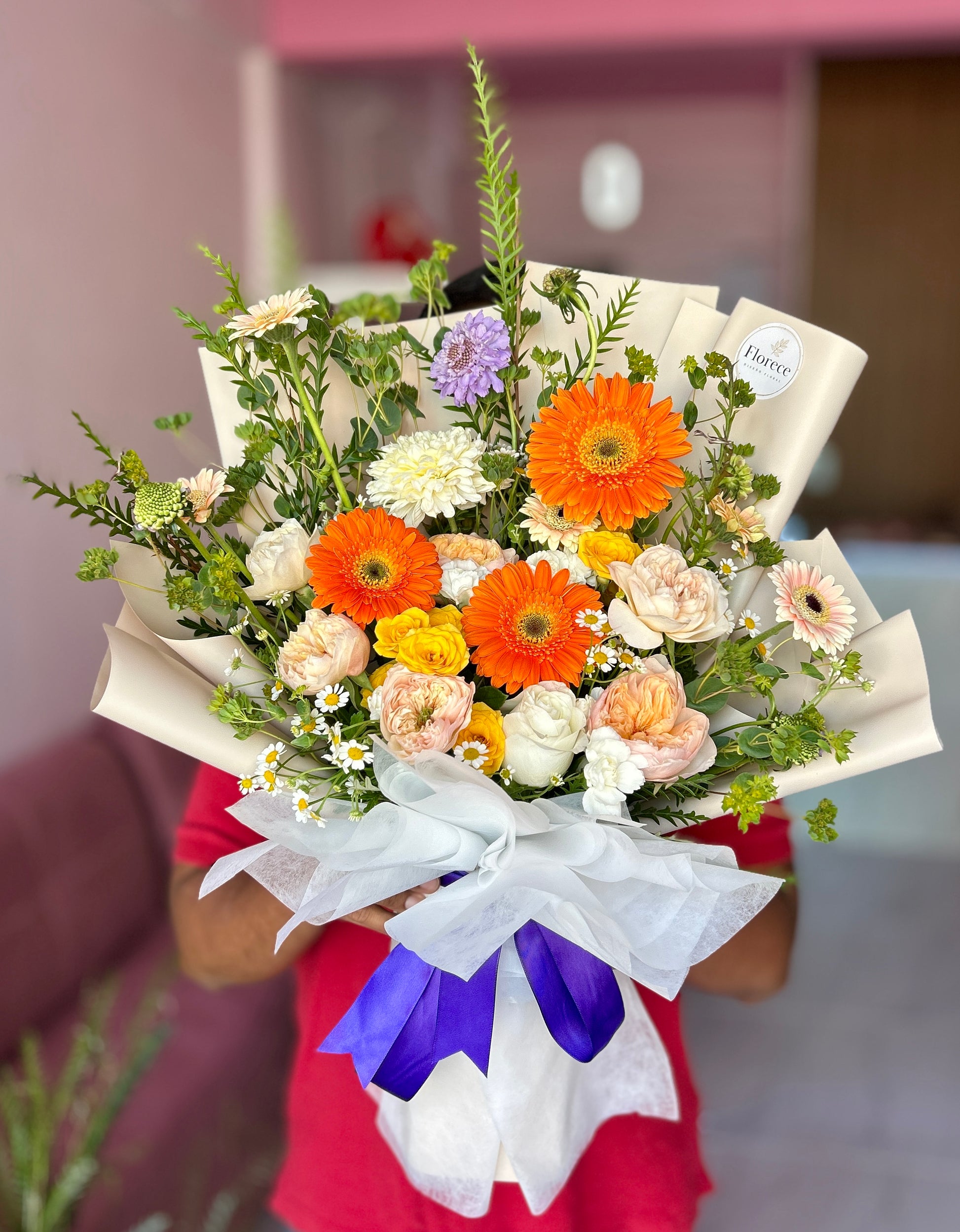 Gerberas, rosas inglesas, mini gerberas, mini rosa, escabiosa, Santa María, follaje en celofán coreano y moño satinado.