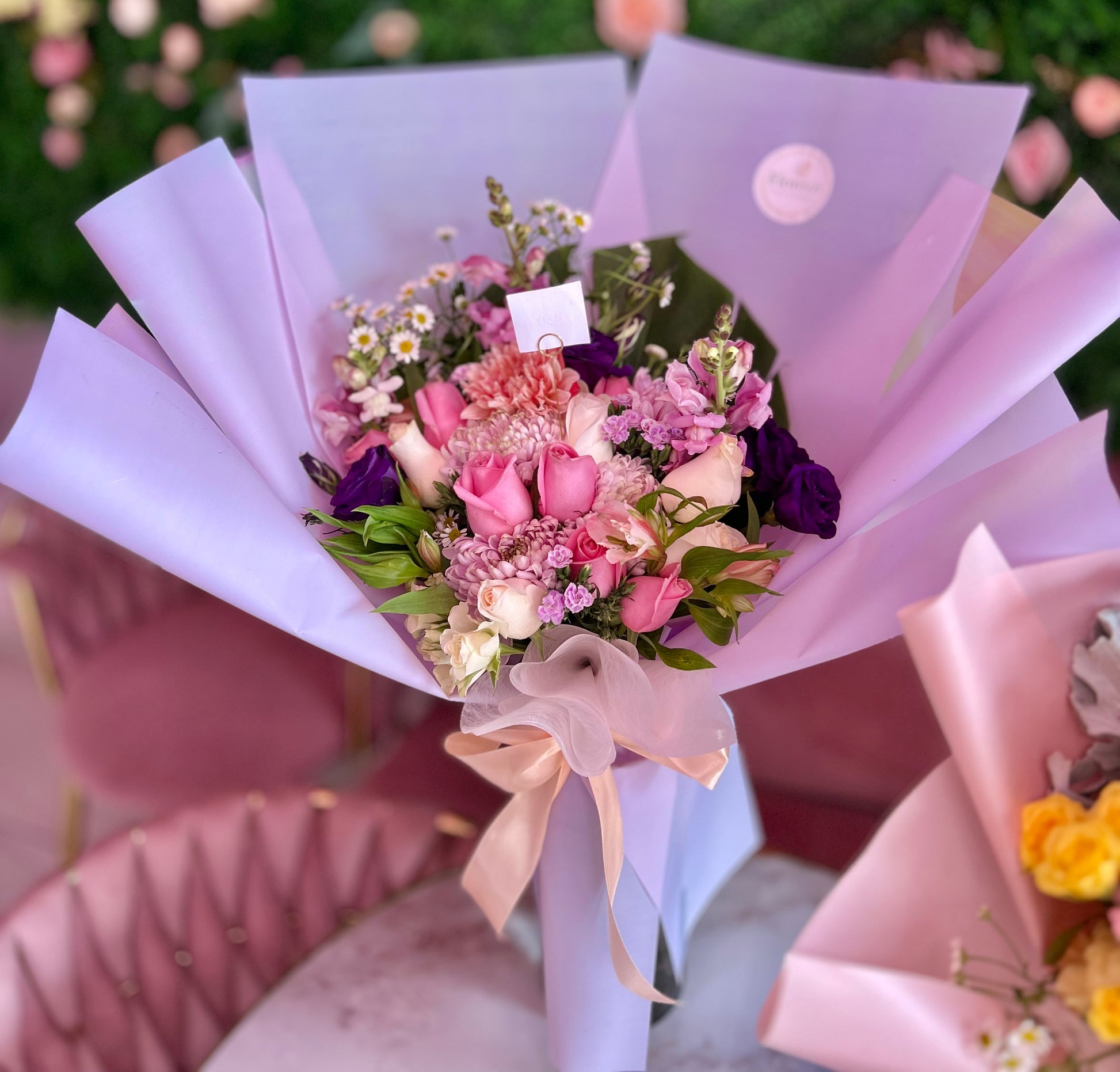Roxanas, rosas, santa maria, piñanona, lisianthus y dólar en celofán coreano y moño satinado.