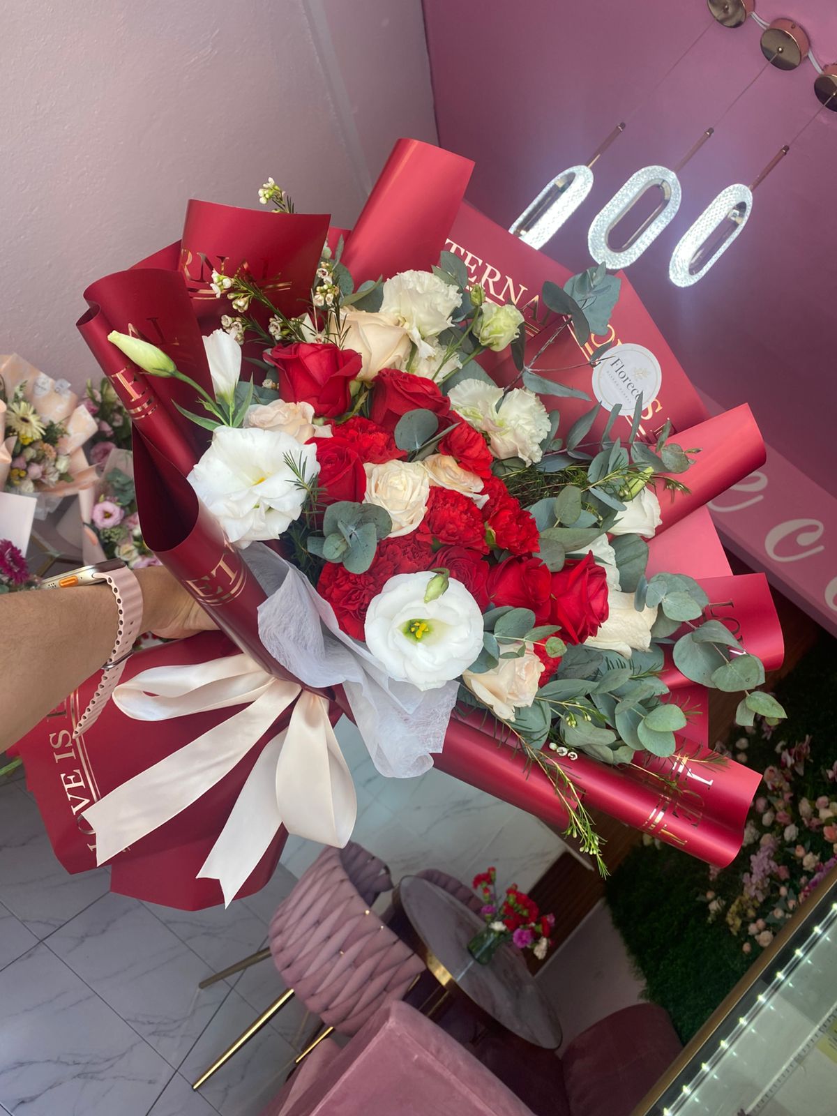 Hermoso ramo con tonalidades rojas y blancas.