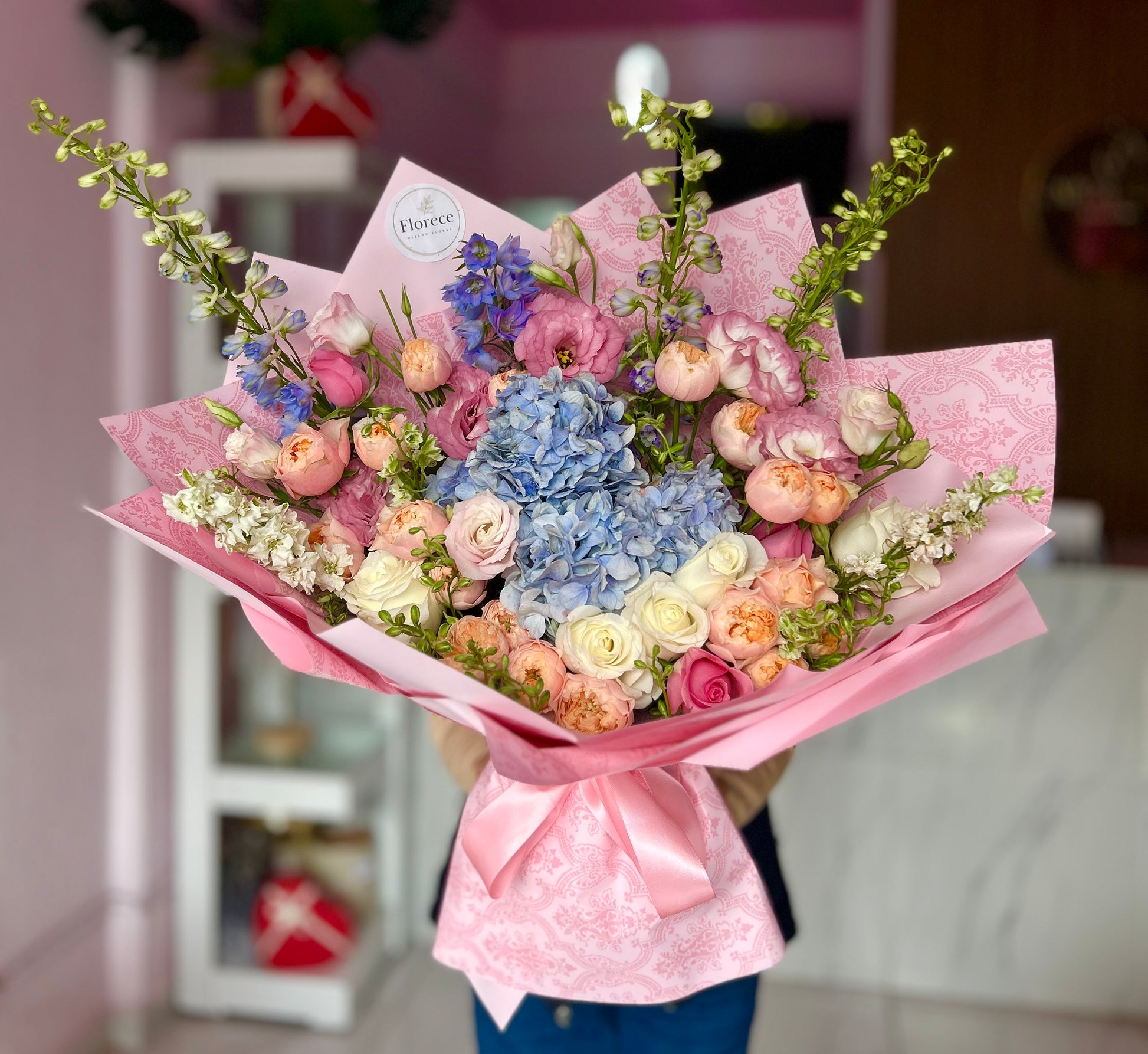 Ramo con rosa inglesa, rosas, delphinium y Hortensia