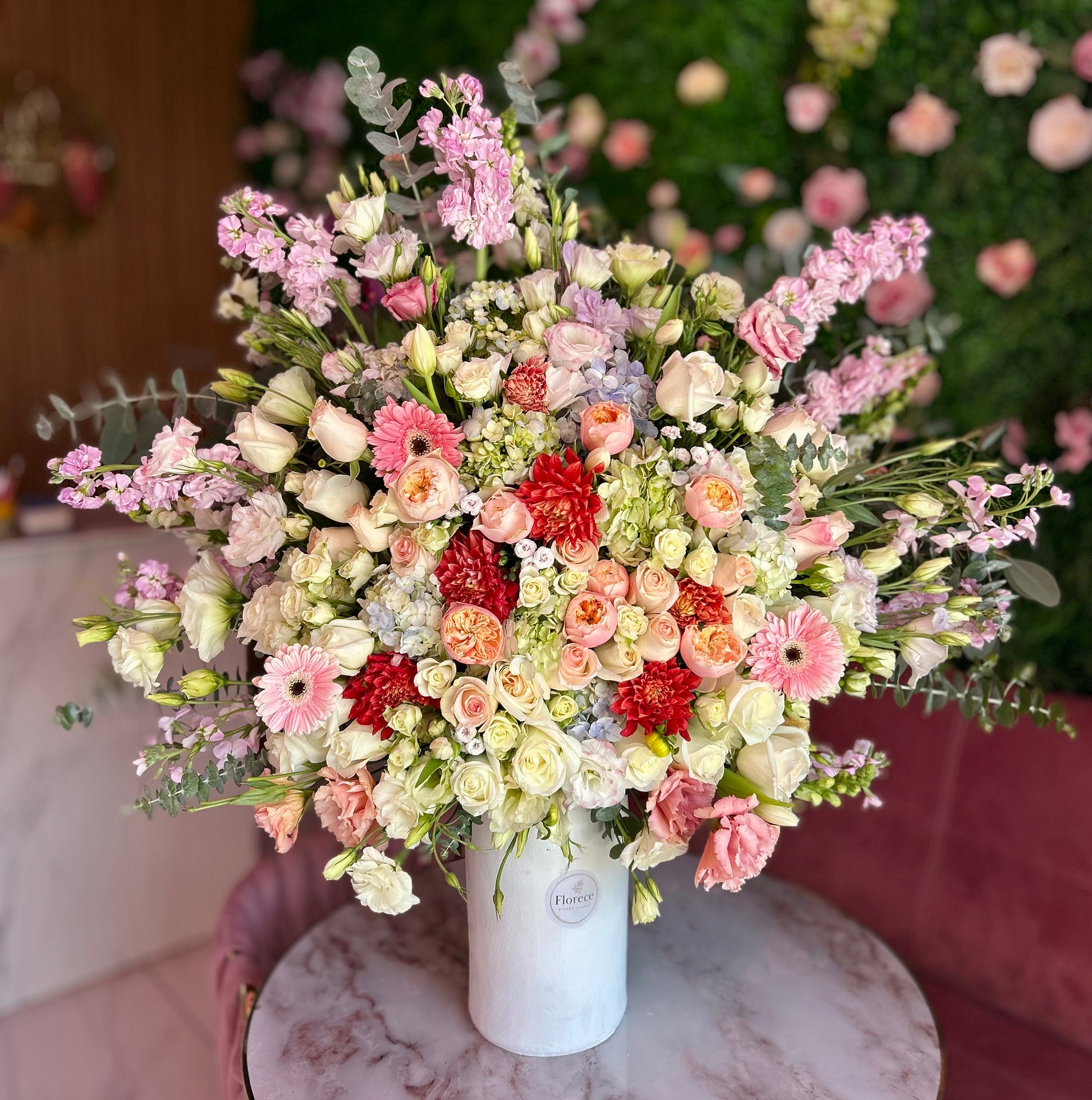 Flores premium: Arreglo con rosa inglesa, hortensias, delphinium, mini rosa, hortensias, rosas, lisianthus en base de cerámica.
