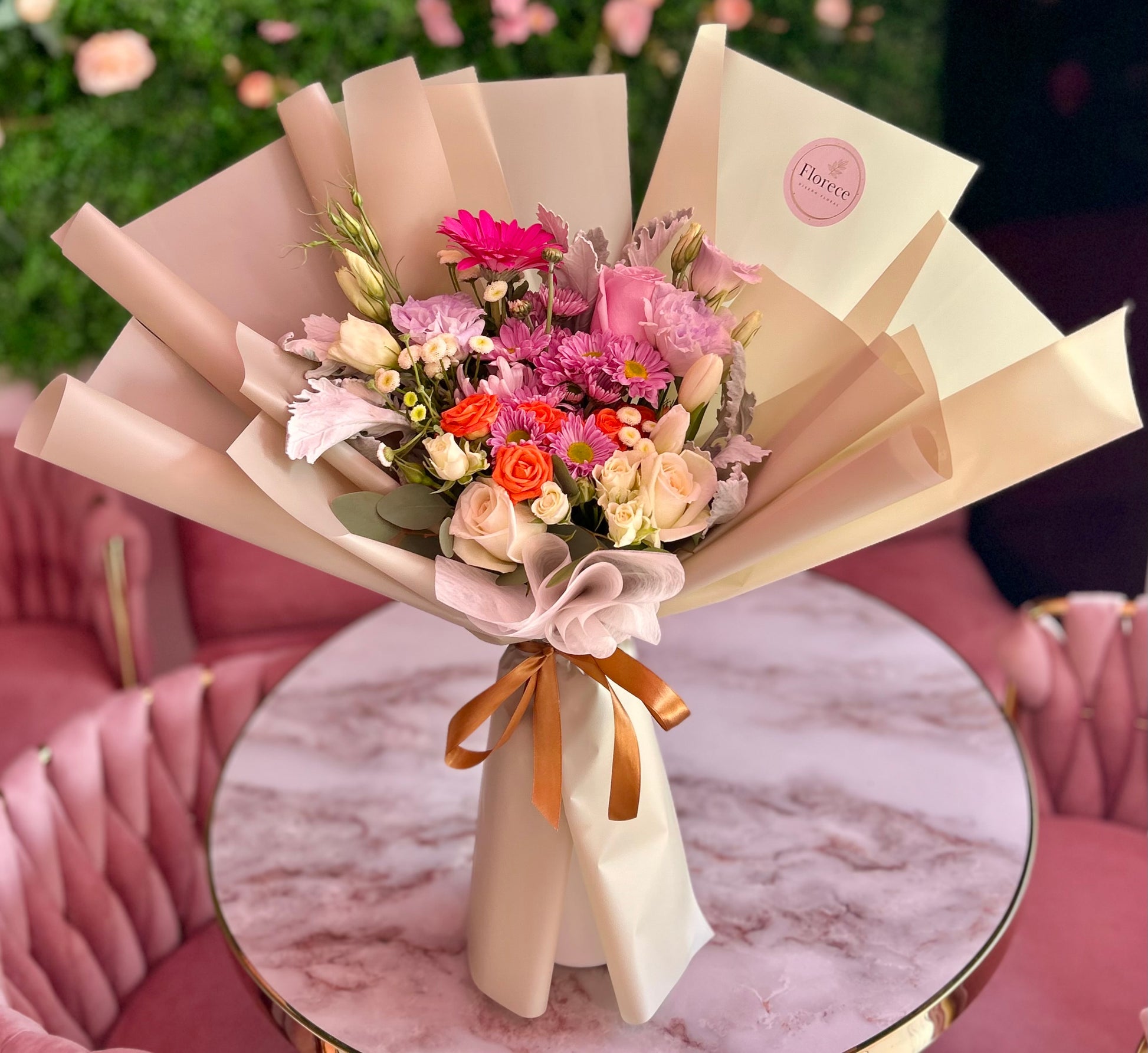 Mini Ramo con gerberas, mini gerberas, mathiola, rosas y follaje.